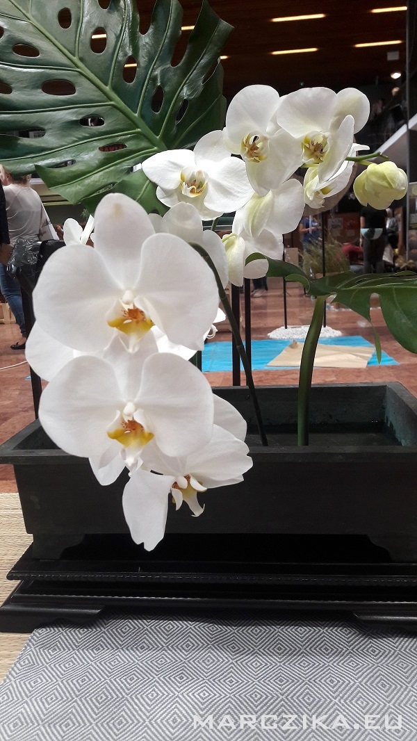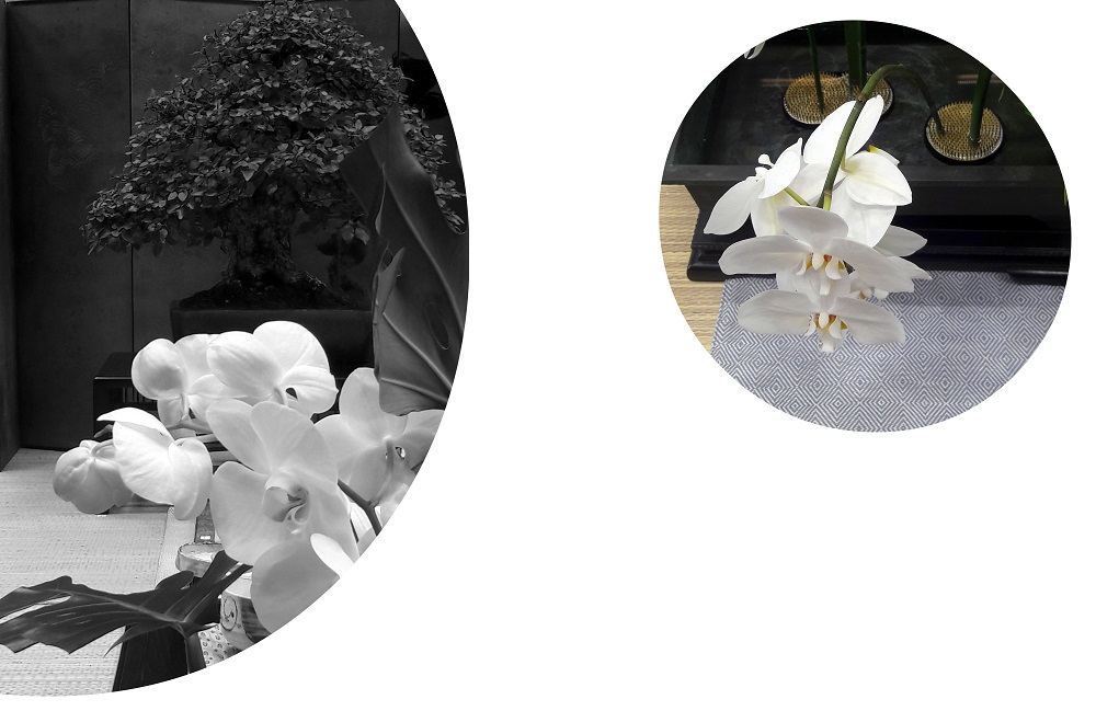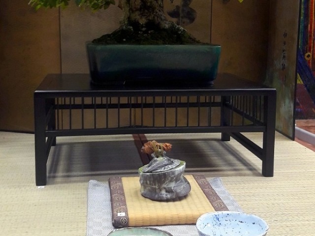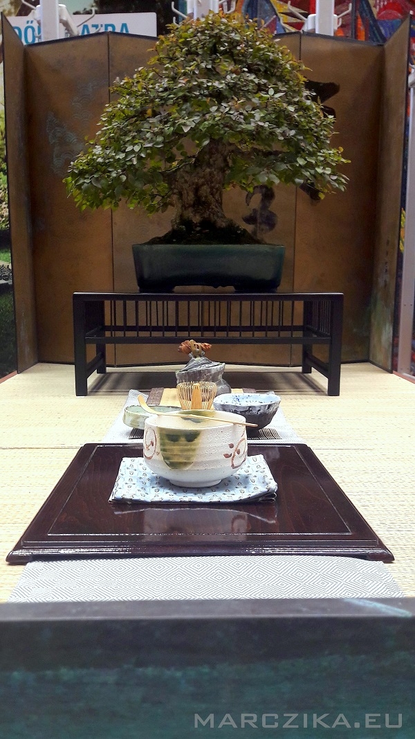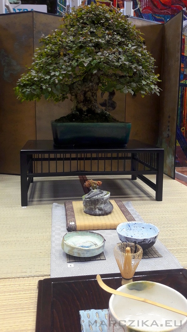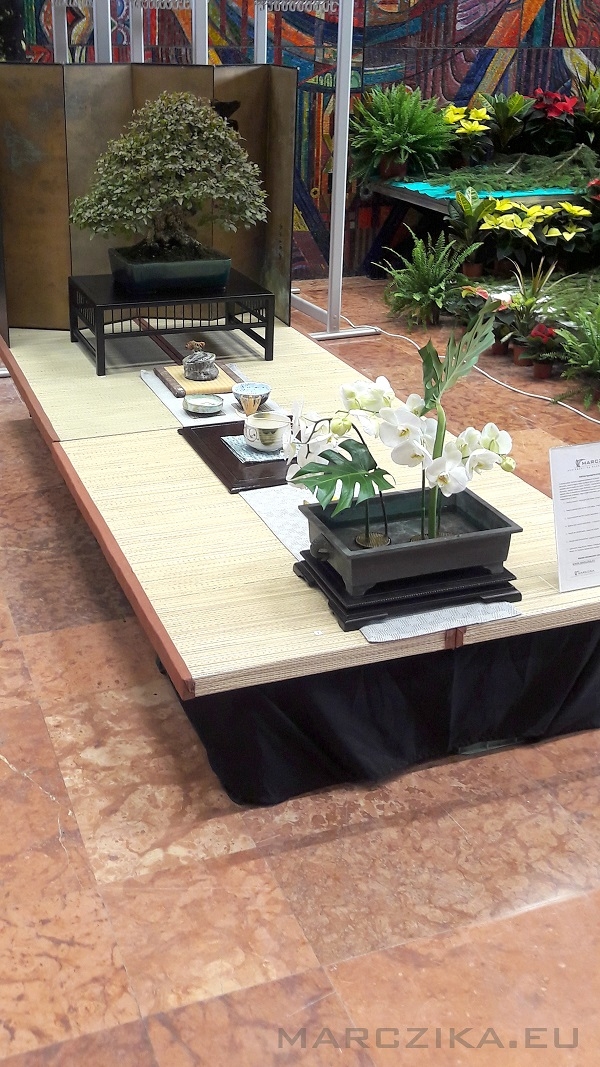 Exhibition of the approaches of Japanese culture - bonsai, orchid and hospitable installation on the tatami. The Autumn Horticultural Days 2019 took place in Budapest on the Buda Campus of Szent István University. This time we were in a segment of the exhibitions where the topic was how we welcome a Japanese guest at home. It was necessary to create a mood that conveys the characteristics of Japanese interiors and showcases elements of Bonsai and Japanese flower arrangements. We thought about this topic, which was mostly based on the question of what if someone else likes / loves Japanese culture and maybe deals with some slice of it? Our answer was a snippet of an example, a fictional situation where a host is a man who deals with bonsai trees - this apple doesn't fall far from us. To make it more colorful and not to exhibit a simple tree, we smuggled a couple more items into our installation, which was helped by the Kitsimono Contemporary Art Workshop. The exhibited Carpinus coreana (Korean Hornbeam) bonsai donut was presented in a Koyo Japanese bonsai bowl and placed on a bonsai table with tatami. We brought along an old Japanese bronze ikebana bowl and served the Japanese tea ceremony and supplies with ikebana making - that was the Kitsimono workshop's exercise. Interestingly, there were some who doubted that the Ikebana composition arranged from Phalaenopsis orchids would stand the test with fresh flowers during the event, but as we had hoped, it withstood it and it was worth putting it in a vase. If you think about it, it can't be a question - as in Japan, Ikebana works are not made for hours or two.