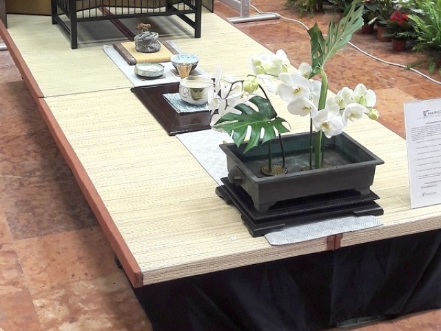 Kiállítás a japán kultúra közelítéseiből - bonsai, orchidea és vendégváró installáció a tatamin. Az Őszi kertészeti napok 2019. Budapesten a Szent István Egyetem Budai Campusán került megrendezésre. Ezúttal a kiállítások közül egy olyan szegmensen szerepeltünk, ahol az volt a téma, hogy mi itthon hogyan fogadunk egy japán vendéget, hogyan látjuk vendégül. Egy olyan hangulatot kellett megteremteni, mely közvetíti a japán enteriőr jellegzetességeit és bemutatja a bonsai és a japán virágkötészet egyes elemeit. Erre a témára fűztünk fel egy gondolatot, ami java részt arra a kérdésre épült, hogy mi van akkor, ha valaki egyébként is szereti/kedveli a japán kultúrát és esetleg valamilyen fokon foglalkozik is valamely szeletével? A válaszunk egy kiragadott példa lett, kigondoltunk egy fiktív szituációt, amiben egy olyan ember a vendéglátó aki bonsai fákkal foglalkozik - ez az alma ugye nem esik messze tőlünk. Azért, hogy mindez színesebb legyen és ne egy egyszerű fát állítsunk ki magában, becsempésztünk még egy-két elemet installációnkba amiben a Kitsimono kortárs művészeti műhely volt segítségünkre. A kiállított Carpinus coreana (Kóreai gyertyán) bonsai fánk egy Koyo japán bonsai tálban lett bemutatva és bonsai asztalra téve a tatamin. Vittünk mellé még egy régi japán bronzból készült ikebana tálat és a japán tea szertartás és kellékei tálalása az ikebana elkészítésével volt a Kitsimono műhely feladata. Érdekes módon voltak akik kétkedtek, hogy a Phalaenopsis orchideákból összerendezett ikebana kompozíció kibírja - e a rendezvény ideje alatt friss virágokkal a megpróbáltatást, de ahogy mi reméltük is, kibírta és még a kiállítás leszedését követően is érdemes volt vázába helyezni. Ha belegondolunk nem is lehet ez kérdés - hiszen japánban sem egy-két órára készítik az ikebana alkotásokat.