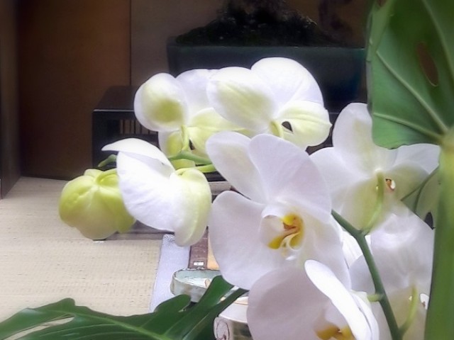 Ha bonsaiból készítünk kompozíciót vendég fogadására, illik minél nyugodtabb hangulatot mutatni a vendégnek. Illik, mert a béke szimbóluma és nem tereli el a figyelmet egy harmónikus növény a társaságról, az együttlétről és az alkalomról. Ugyanakkor a szépség és a kellemes meghökkenés kellő tiszteletet is ad és persze említeni sem kell, hogy mindez kikapcsol minket (is)... Emellé társítunk orchidea ikebanát, hogy kellemesebb legyen a közvetlen környezet és ezeknek a könnyed növényeknek az élvezete is könnyed - így ezek sem elterelik a figyelmünket, csak kellemesebbé teszik vendégségben a térérzékelést. Ugye mennyivel jobb így felszabadulni? Ehhez adódik még a japán zöld teázás nyugalma és adja magát a dolog, hogy nem csak japán vendéggel lehet/érdemes ilyen módon találkozni. Bárki érkezik hozzád, vagy bárkivel találkozol, dobd fel a lakást bonsai vagy orchidea kihelyezésével! Ha friss orchidea vagy egy új bonsai kellene hozzá, nincs más dolgod mint webáruházunkban vagy kertészetünkben körbenézni.