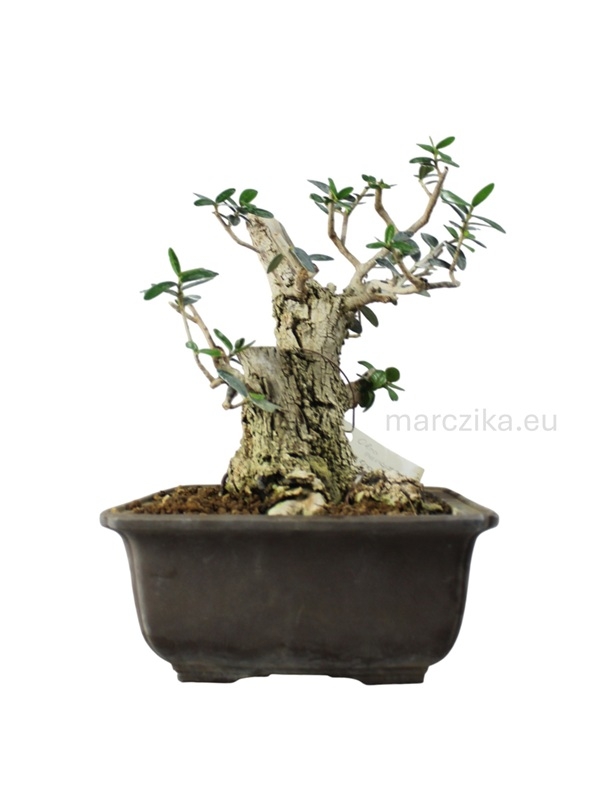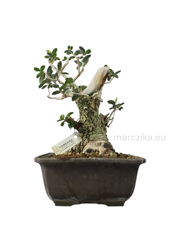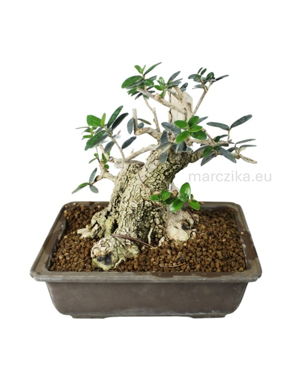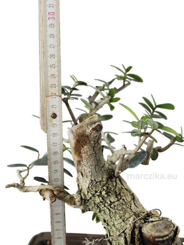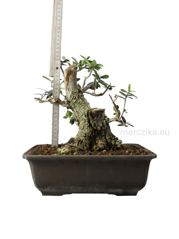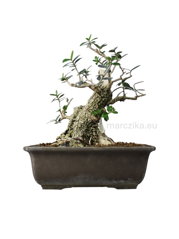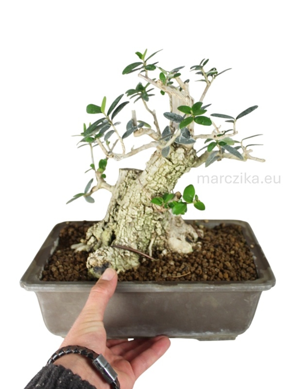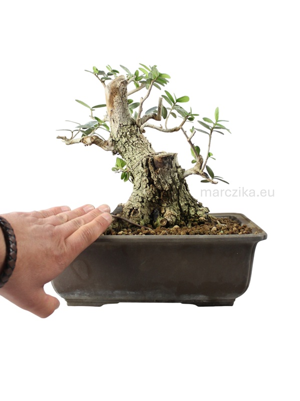 Sok éve rendszeresen iskolázott bonsai alapanyag. Jelenlegi magassága a nebaritól mérve ~25 cm. Ebben a méretben elsősorban az un. kifu méretkategóriában való tovább nevelés adja magát de akár a shohin méretkategóriában is lehet jövője a fának. Mivel az Olajfák esetében gyakran szeretnek a bonsai kedvelők deadwood technikákkal élni ezért hagytunk rajta ehhez elegendő kidolgozható részt. Pár év metszéssel, drótozással és némi deadwood alakítással fantasztikus bonsait alakíthatunk ki magunknak belőle - aki így tesz, azé lesz a dicsőség!